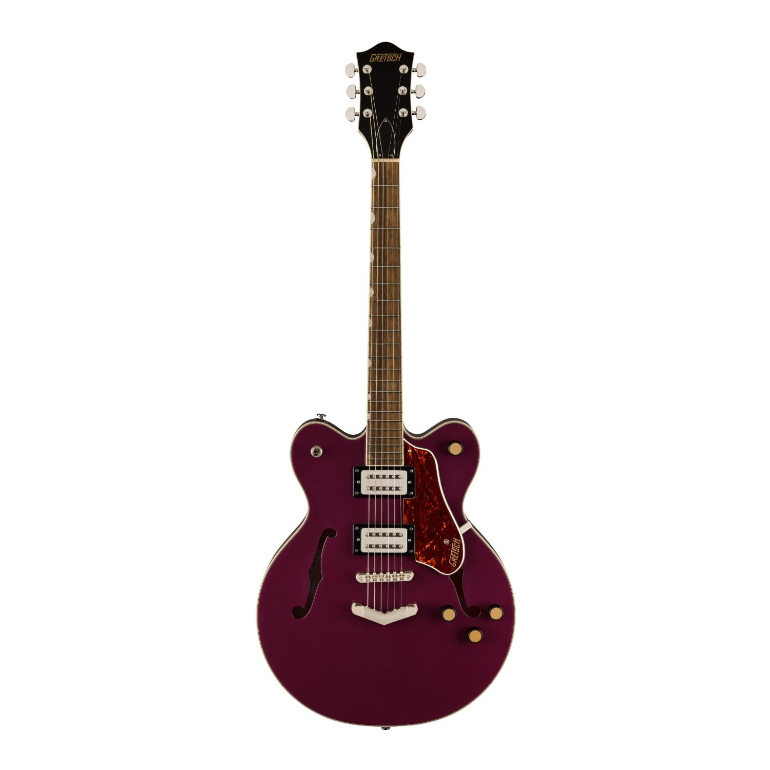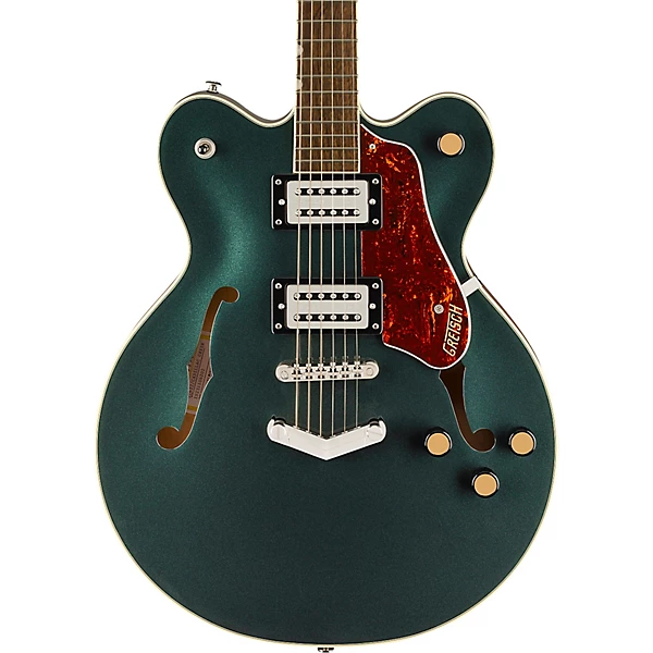 - Body: Laminated maple top, back, and sides with a spruce center block for semi-hollow warmth and reduced feedback, even at high volumes. The double-cutaway design ensures ergonomic comfort and easy upper-fret access, while the 16″ wide body provides classic Gretsch resonance.