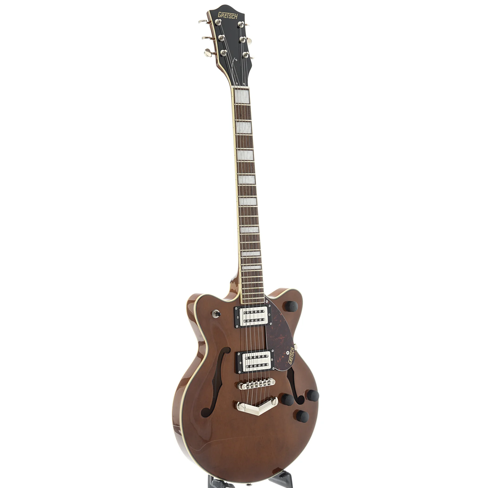 - Body: Laminated maple top, back, and sides with a spruce center block for semi-hollow warmth and reduced feedback at high volumes. The double-cutaway design ensures ergonomic comfort and easy upper-fret access, while the 16″ wide body provides classic Gretsch resonance.
